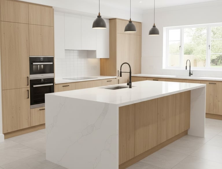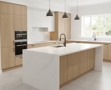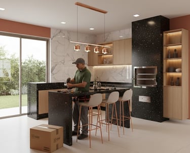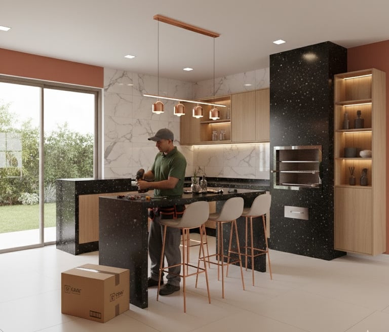 Fabricação e instalação de bancadas, ilhas e frontões, com cortes precisos para cubas e cooktops, com materiais como Granitos, Quartzo (Silestone, Caesarstone, etc.), Mármores (para áreas com menor uso).